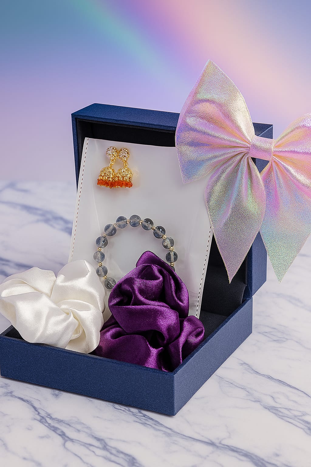 ✨ PresentsySoul Accessory Set – 1 Elegant Earring, 1 Chic Bow, 1 Stylish Bracelet & 2 Soft Scrunchies ✨